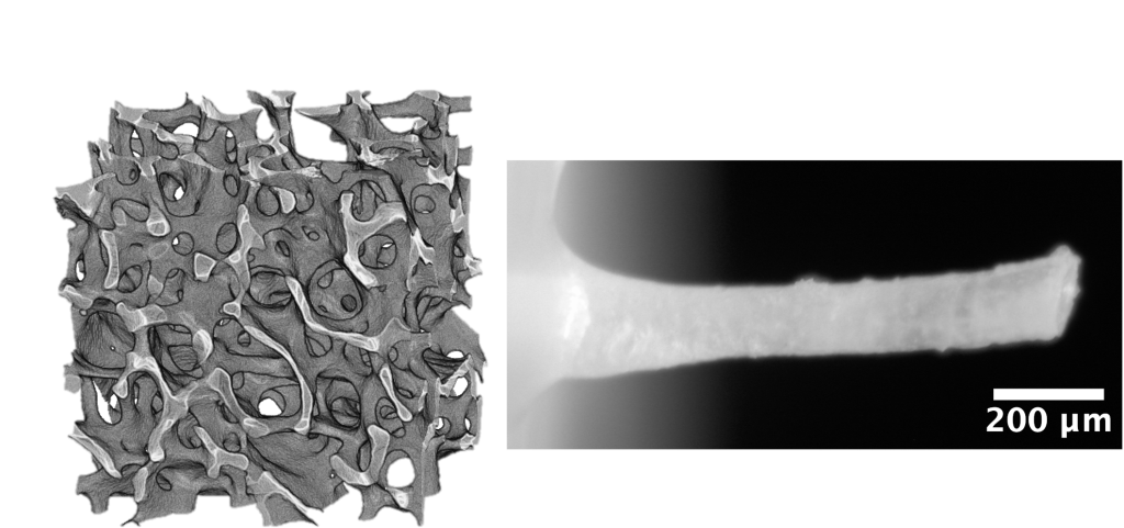 骨粗鬆症では、軽微な衝撃であっても海綿骨部位に骨折が多発します。この研究では、骨量に加えて骨梁一本一本の衝撃強さやマイクロアーキテクチャが海綿骨の動的強度を決定するという仮説のもと、これらを実験的に解明しています。得られた知見を基に、骨折リスクの診断および制御への応用を目指します。